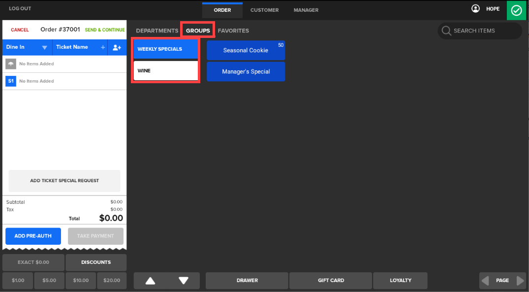 When the Cashier starts a new ticket, Groups automatically display.