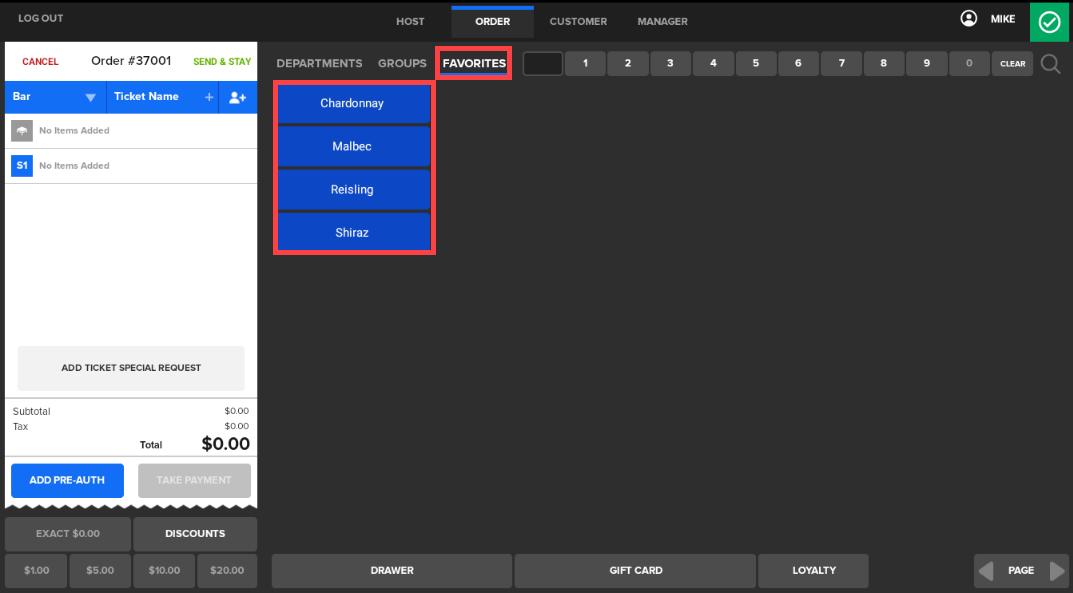 When the Bartender starts a new ticket, Favorites automatically display.