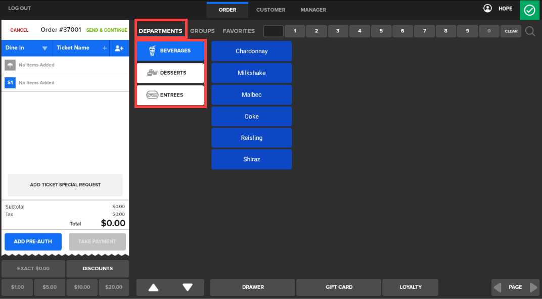 When the Server starts a new ticket, Departments automatically display.