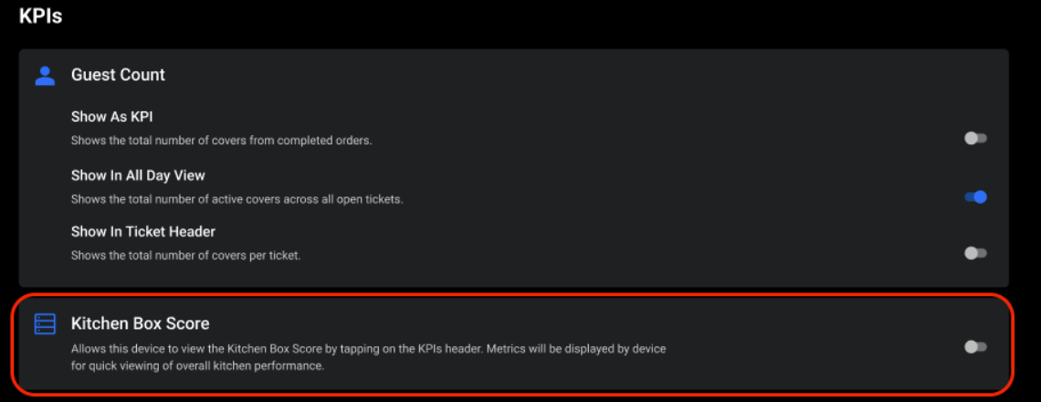 From within the Settings screen, under KPIs, toggle Kitchen Box Score to the right (on).