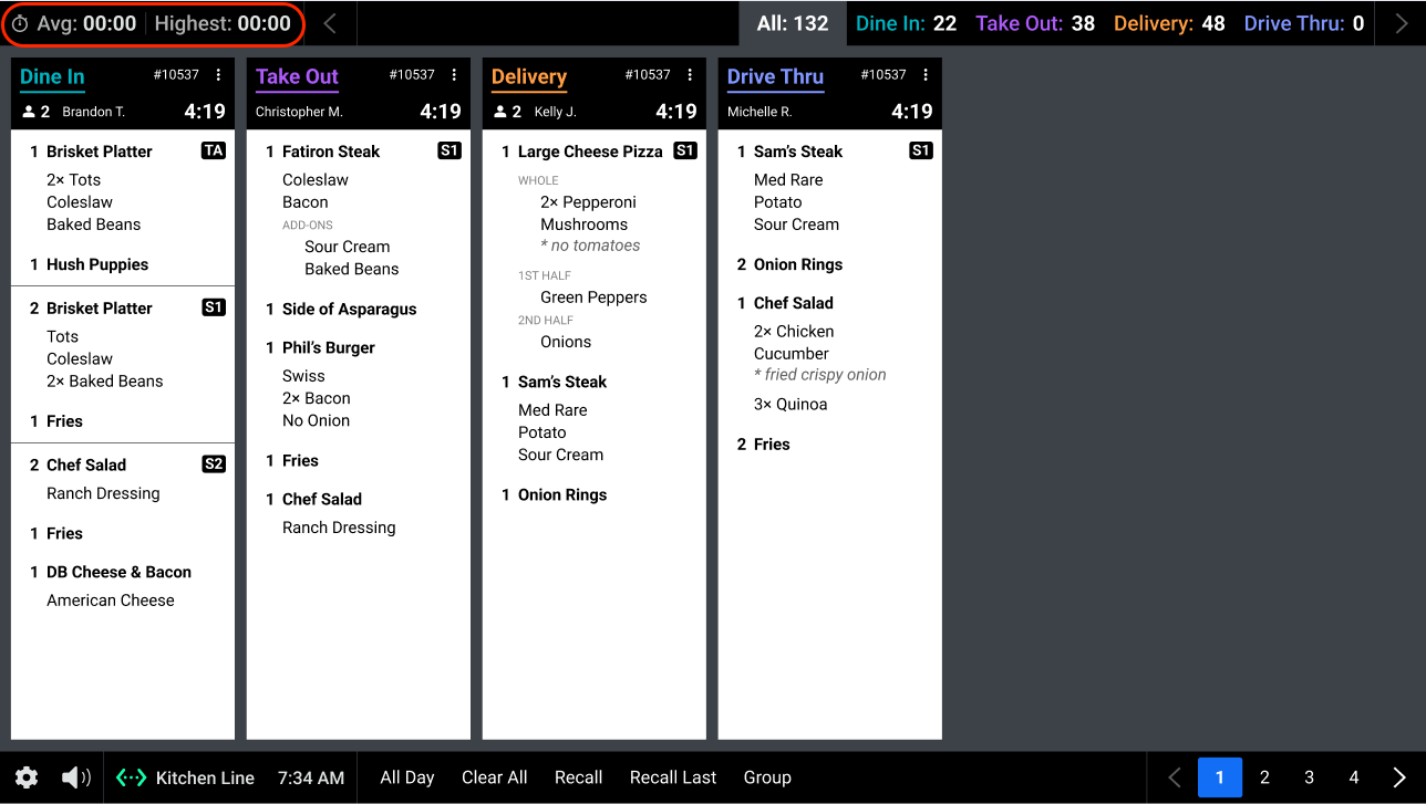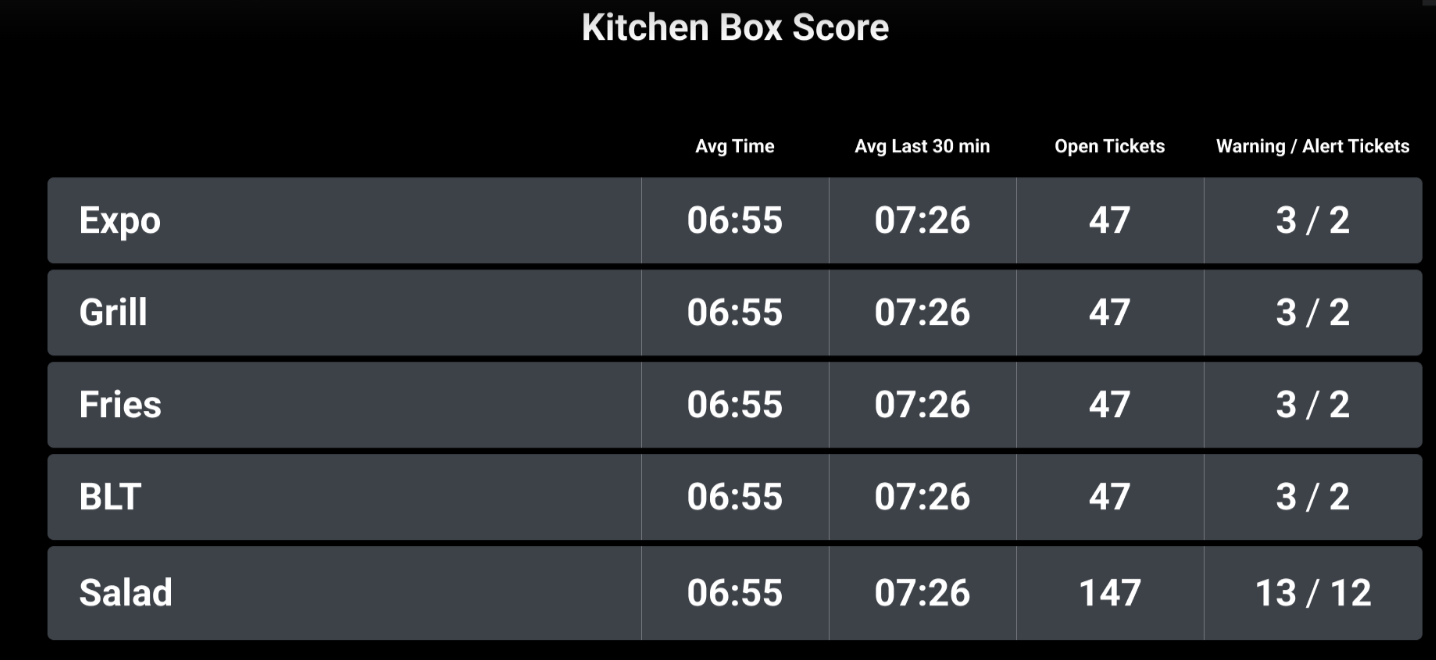 The Kitchen Box Score Displays the following by KDS:- Current KPI Avg Ticket Time
