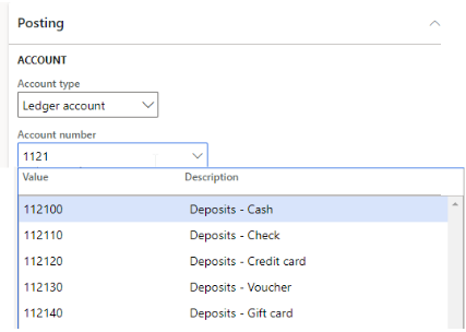 - In the Posting section, under ACCOUNT, make sure that an appropriate Account type and Account number are selected. In the image below, we are using ‘Ledger account’ as the account type and their respective ‘Deposit’ account numbers.