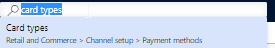 - Navigate to Retail and Commerce > Channel setup > Payment methods > Card types.