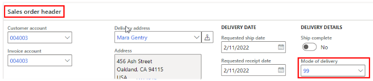 - Under the Sales order header, make sure that a Mode of delivery is selected.
