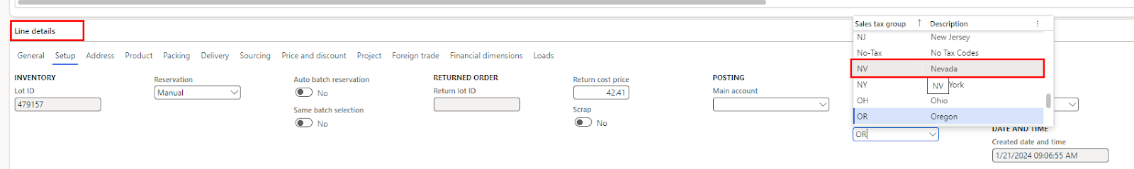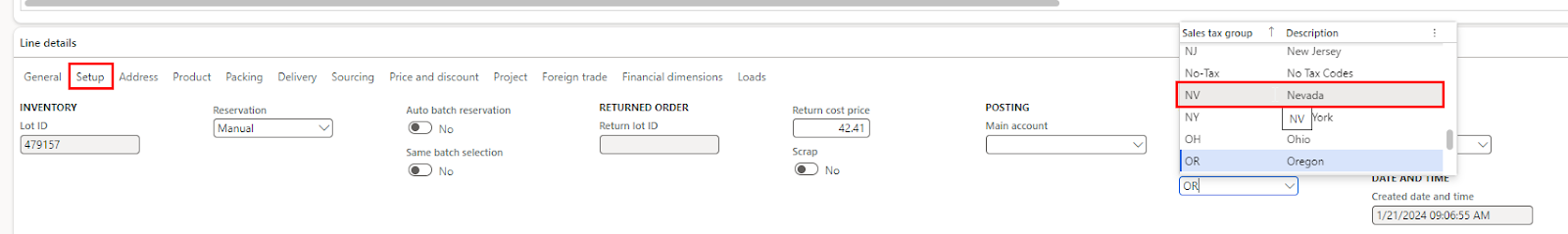 - Under the Sales tax group section, select NV for Nevada (to populate NV sales tax on your order).