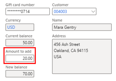 - Doing this will automatically populate the rest of the fields in the form. Enter the amount you’d like to add to the gift card under the "Amount to add" field.