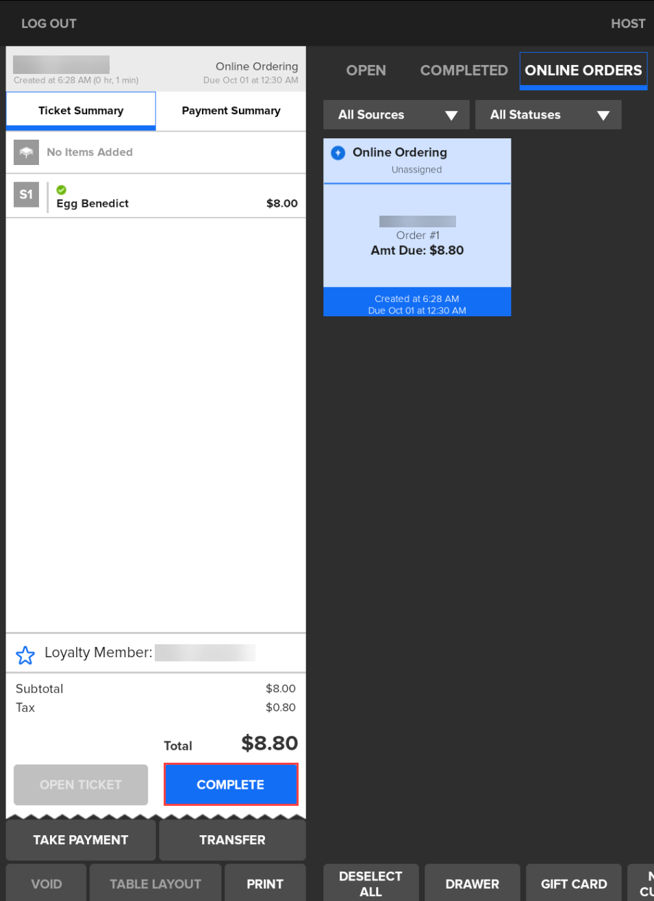 - Select the ticket displayed and then select Open Ticket. You can take payment, void items, remove or restore taxes, and print the guest check receipt using the Print button.