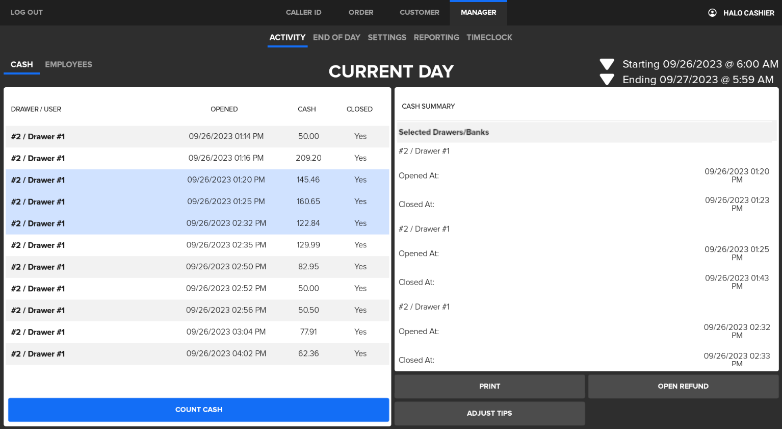 Go to Manager, and you will see the Activity screen. This screen will display all of the store activity for the day.