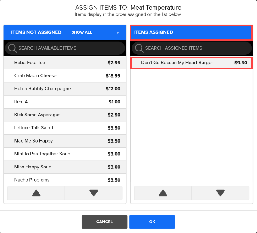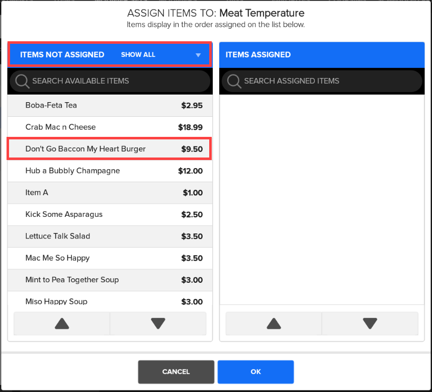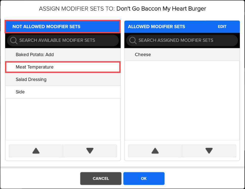 - On the Assign Modifier Sets To window, locate the item you would like to assign from the "Not Allowed Modifier Sets" list.