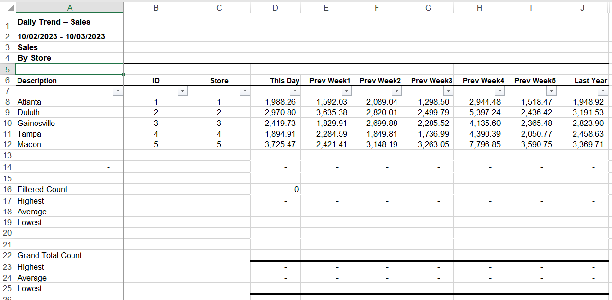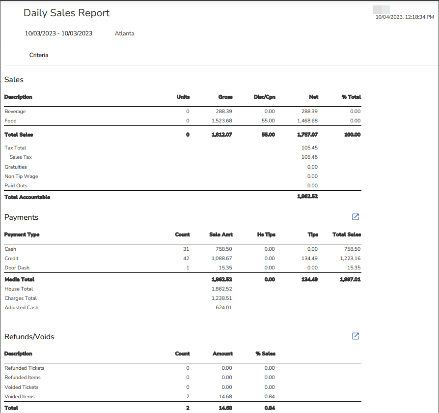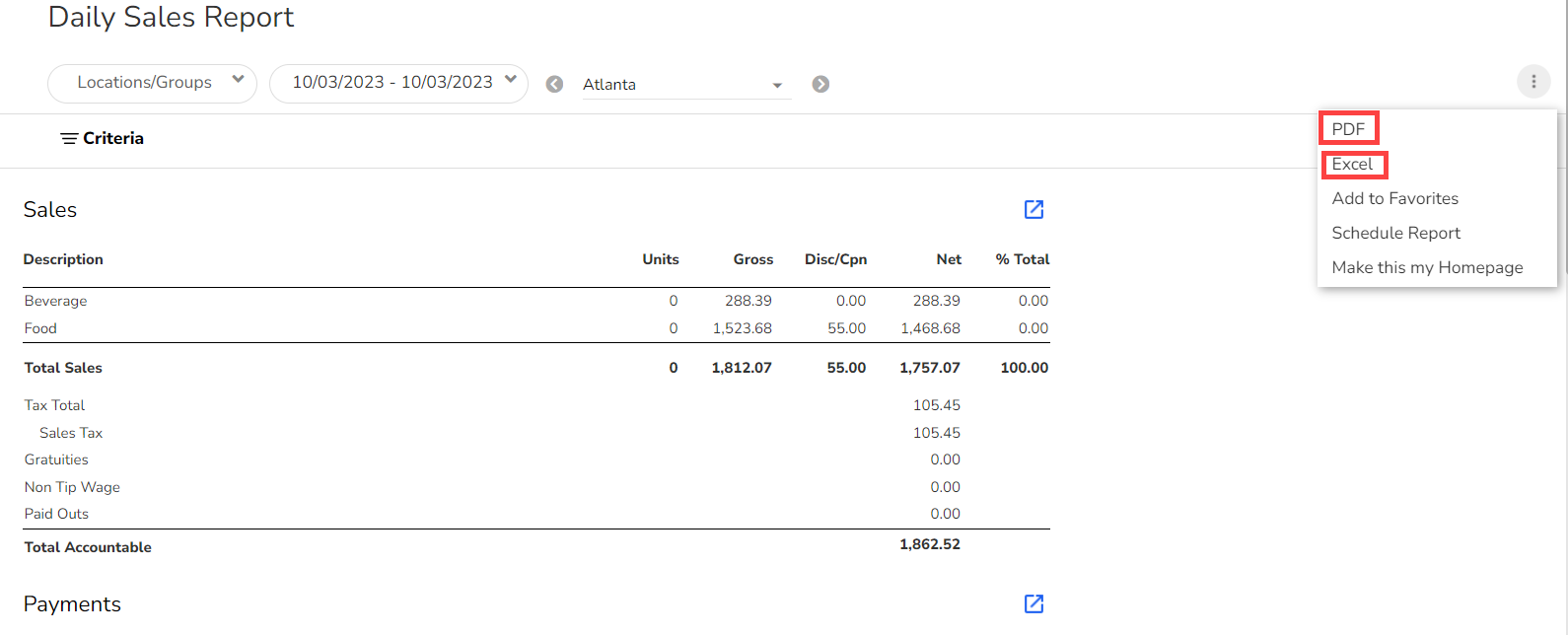 For example, if you want to export your Daily Sales Report, you can do that with STBI by selecting the three dots (ellipsis) at the top right of the Daily Sales Report, seen below, and selecting PDF or Excel.