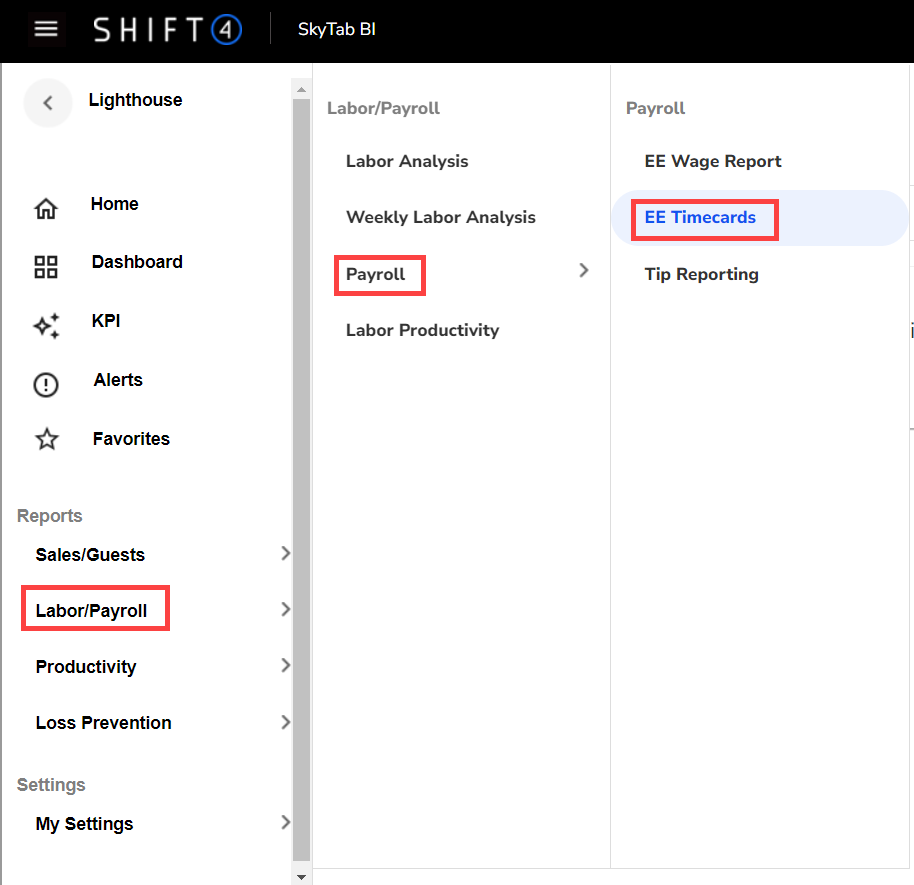 Navigate to Labor/Payroll > Payroll > EE Timecards to run an Employee Timecard Report.
