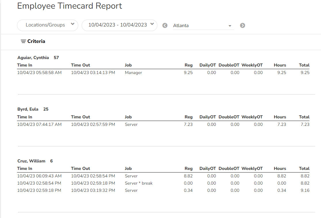 This report shows the employee Time In and the Time Out. Check the column for long shifts, and then look at the far column on the right and it will give you the running hours for the week.