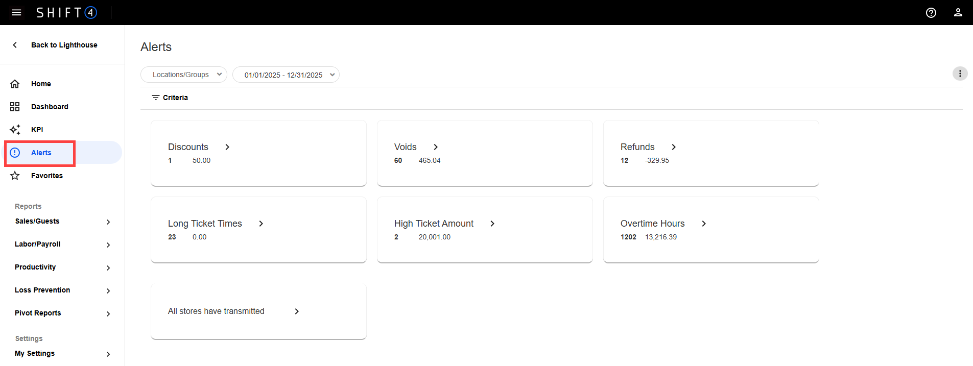 From the left navigation menu, select Alerts to view Discounts, Voids, Refunds, Long Ticket Times, Excess Tips, High Ticket Amount, and Overtime hours.