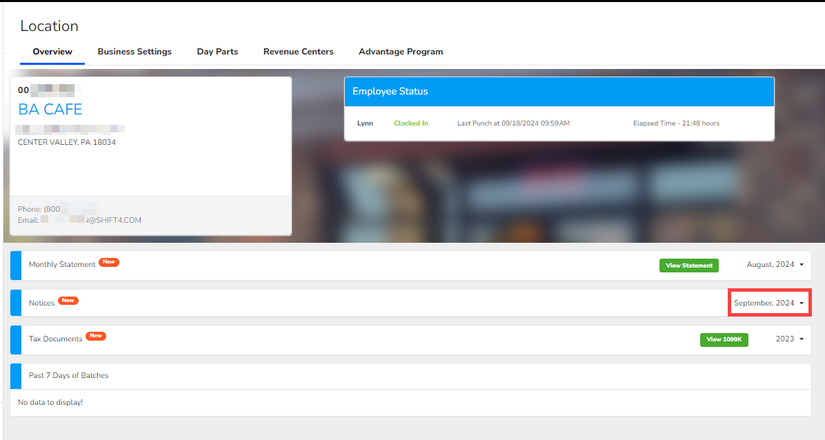 - On Location Overview, select the Notices section by pressing on the date dropdown. This will open the calendar, allowing you to select the month.