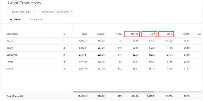 Lbr %: The labor % for the time period selected. Lbr $ divided by Sales$