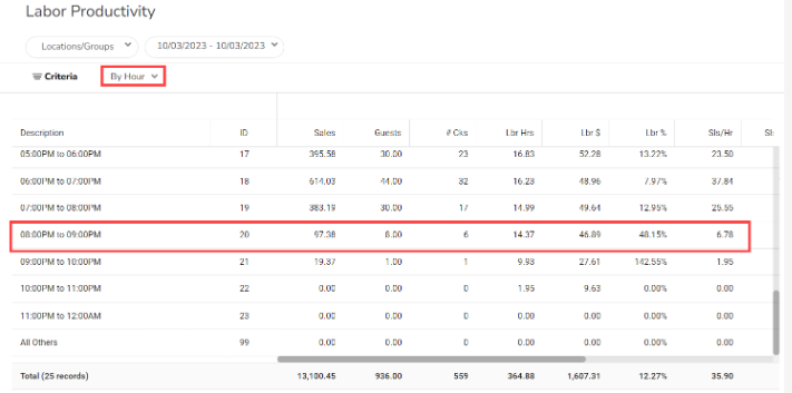 As you can see in the highlighted hour, the Lbr % was 48%. Notice the Sls/Hr was only $6.78. If this report is used to its fullest, it can help to reduce labor costs.