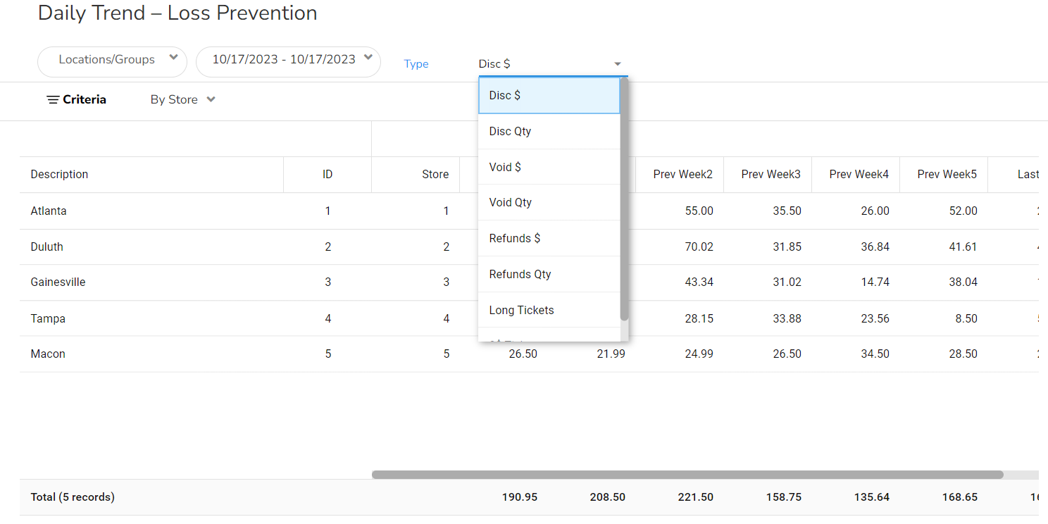 To access this report, select Productivity, then Trends - Daily Loss Prevention. The report will show you a five week trend of Disc $, Disc Qty, Void $, Void Qty, Refund $, Refund Qty, and Long Tickets. Choose which metric you want to view and run the report.