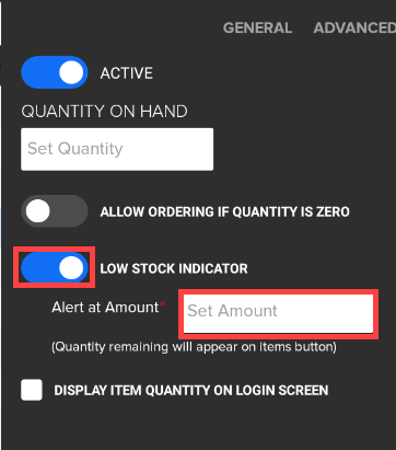 - Slide the toggle on (blue) for "Low Stock Indicator" and enter an amount in the "Alert at Amount" field. This will show the item as "Almost Sold Out" on SkyTab Online when the item gets to or below the threshold.
