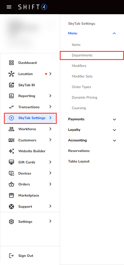 - Log into Lighthouse, and go to SkyTab Settings > Menu > Departments.