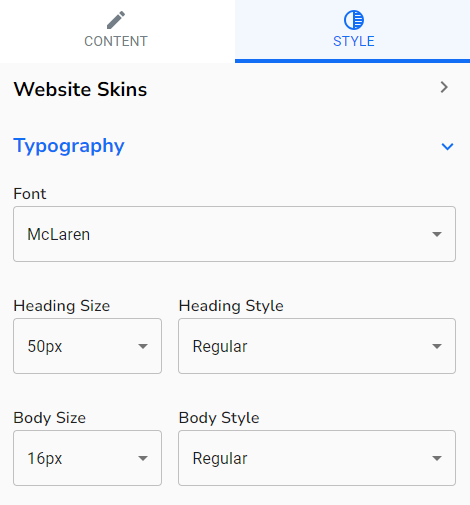 Typography involves the appearance and sizing of elements on the website like font type and style and size for heading and body for the different sections of the website. Use the dropdown in each field to make your selections.