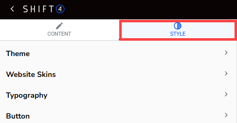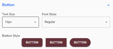 This controls the appearance of the buttons everywhere on the website, including the top navigation and within the individual sections. Use the dropdown to change the Text Size and Font Style. Choose the Button Style from the selections available.