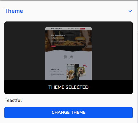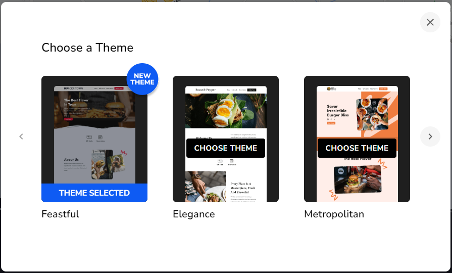 SkyTab Website Builder offers three customizable themes, allowing you to modify certain aspects to suit your preference or brand identity. Selecting the "Change Theme" button brings up the model with a list of the available themes. The currently applied theme is shown as "Theme Selected" in blue, and the rest of the themes are available for selection by selecting "Choose Theme." Use the left and right arrow buttons to scroll through the themes.