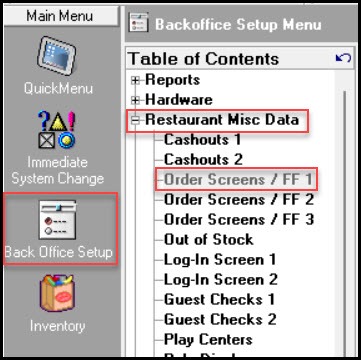 - From the Main Menu, select Back Office Setup > Restaurant Misc Data > Order Screens / FF1.
