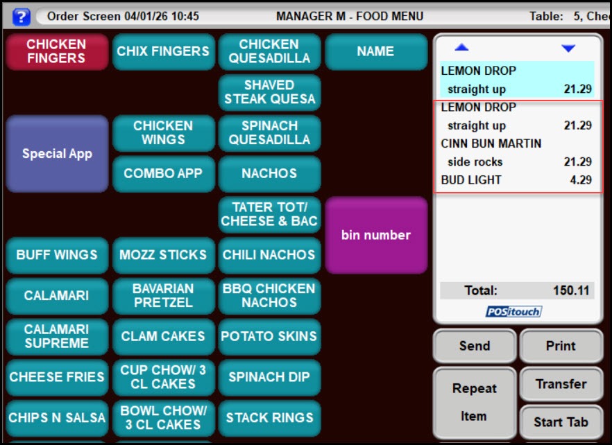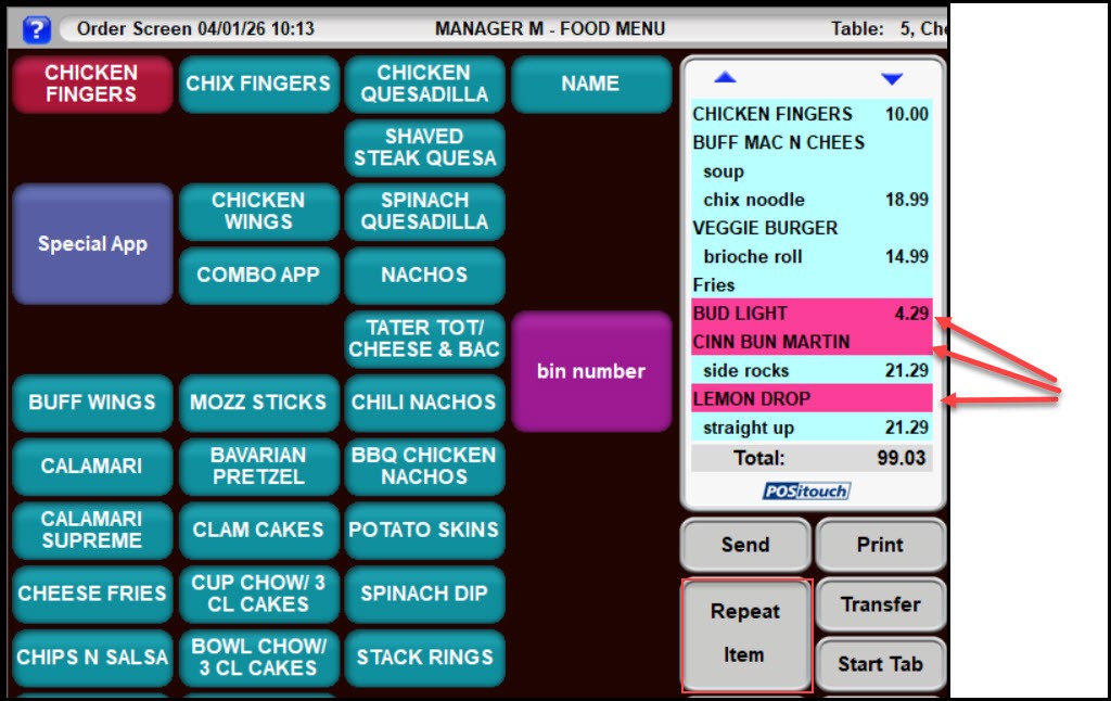 The repeated items will appear on the guest check and can be sent to the prep stations as needed.