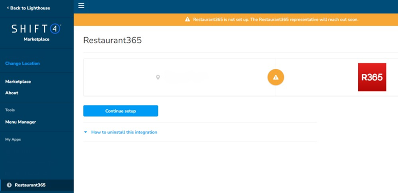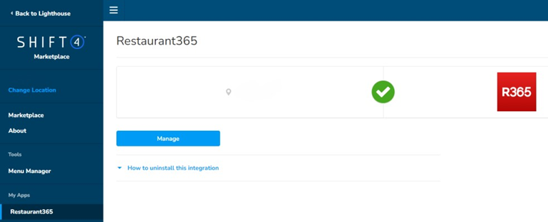 - Once Restaurant365 has linked your account, you will see a green checkmark, indicating a successful installation. The clock symbol in the left navigation sidebar will also have been removed. Once installed, you also have the ability to manage your account or uninstall the application at any time.