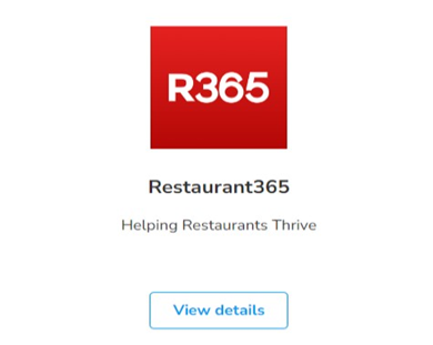 - Select Marketplace from the left navigation bar, then select Restaurant365. Click View details to access the Restaurant365 application page.