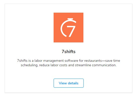 - Select Marketplace from the left navigation bar, then select 7shifts. Select View Details to access the 7shifts application page.