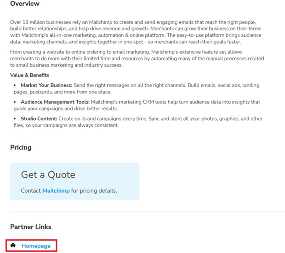 - Log in to Lighthouse Business Manager and select Marketplace in the left navigation sidebar. Choose Mailchimp, then select Homepage under the “Partner Links” section to inquire about becoming a Mailchimp customer. Alternatively, you can go here.