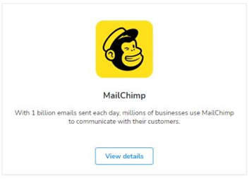 - Select Marketplace from the left navigation bar, then select Mailchimp. Select View Details to access the Mailchimp application page.