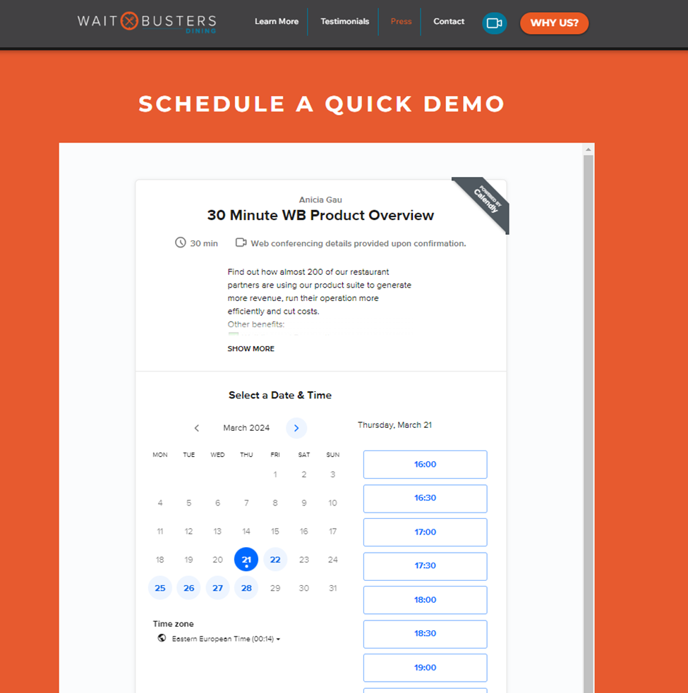 - On the Waitbusters website, scroll to the bottom of the screen to schedule a demo. Choose a date and time to speak with the Waitbusters team and someone will assist you with your account setup.