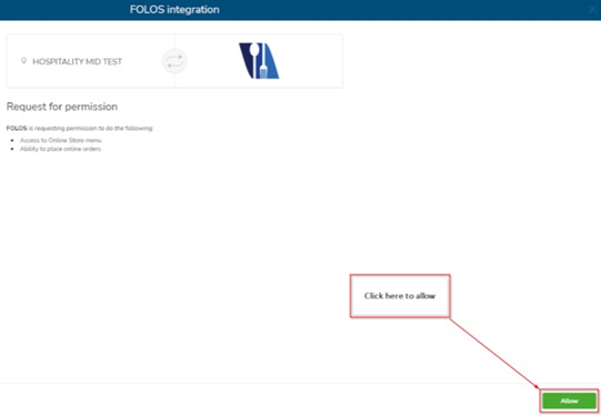 Note: If the application prompts you to “Request POS Upgrade” you must select that and follow the prompts to arrange for a software update before you can continue with the installation. - The installation will begin. Once redirected to the FOLOS integration screen, select Allow to continue the installation process.