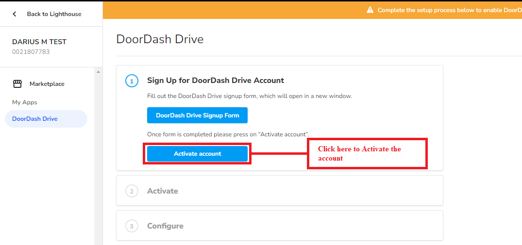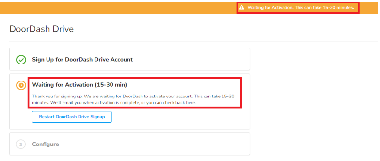 After returning to the DoorDash DriveMarketplace page, press "Activate Account" to start the activation process. DoorDash will now activate your account, which can take up to 30 minutes to complete.