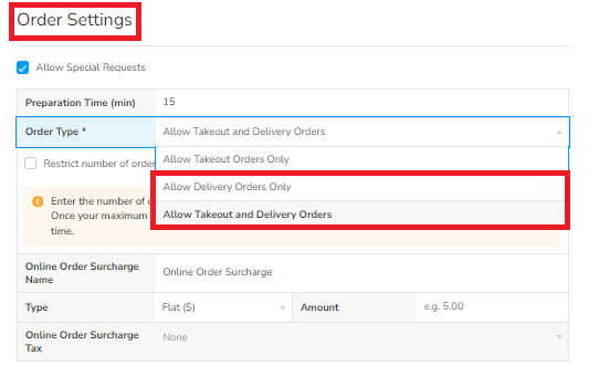 Note: You can disable delivery orders at any time by changing the option to Allow Takeout Orders Only.