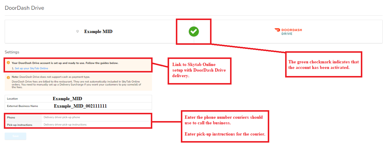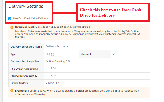 SkyTab Online Configuration for DoorDash Drive Order and Delivery Settings