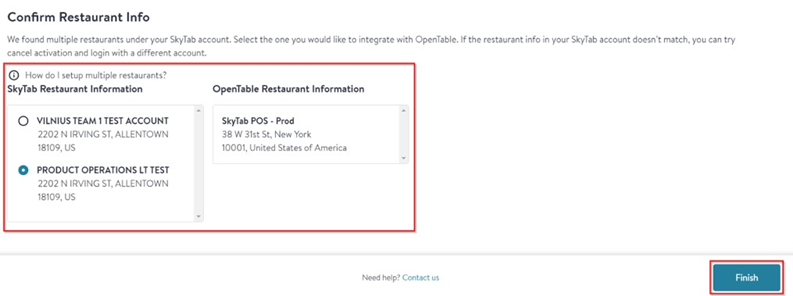 OpenTable. If there are multiple accounts, select the one you wish to connect to OpenTable and then select Finish.