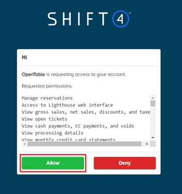 - Once signed into Lighthouse Business Manager, select Allow to grant OpenTable access to your Shift4 location’s data.