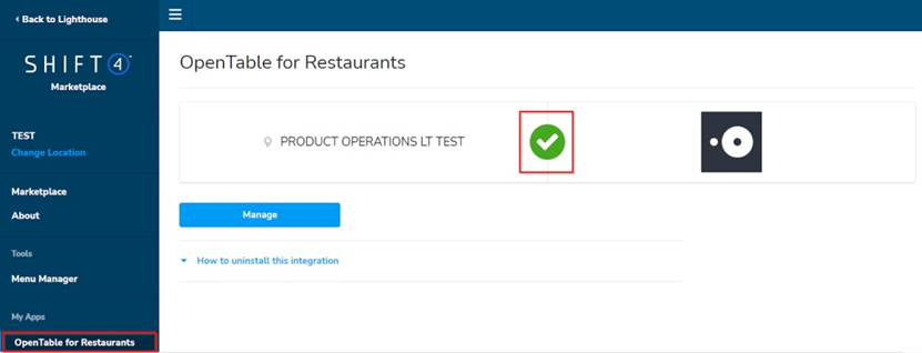 - The OpenTable application is now installed in the Shift4 Marketplace. Selecting the application in the left navigation menu will display a screen showing the installation status. A green check mark on the screen indicates that the application is installed correctly.