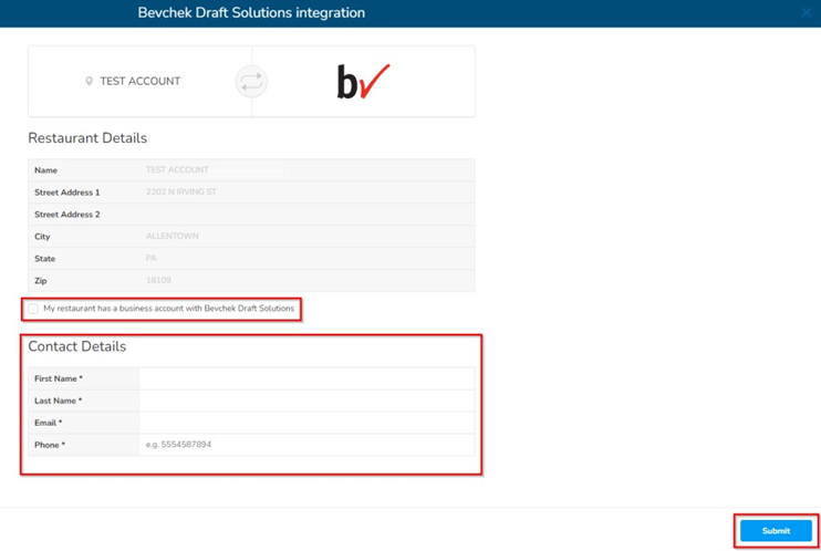 - If you already have a Bevchek Draft Solutions account, check the box for “My restaurant has a Bevchek Draft Solutions business account.” This will prompt the Bevchek Draft Solutions team to find your existing account and activate your Marketplace application.