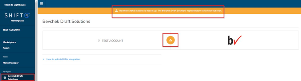 Note: You will now notice the application page shows a yield sign in an orange circle and a clock symbol next to Bevchek Draft Solutions on the left navigation sidebar. This indicates the installation is still pending. - At this point, you will be contacted by Bevchek Draft Solutions to go through an onboarding process before the accounts are linked.