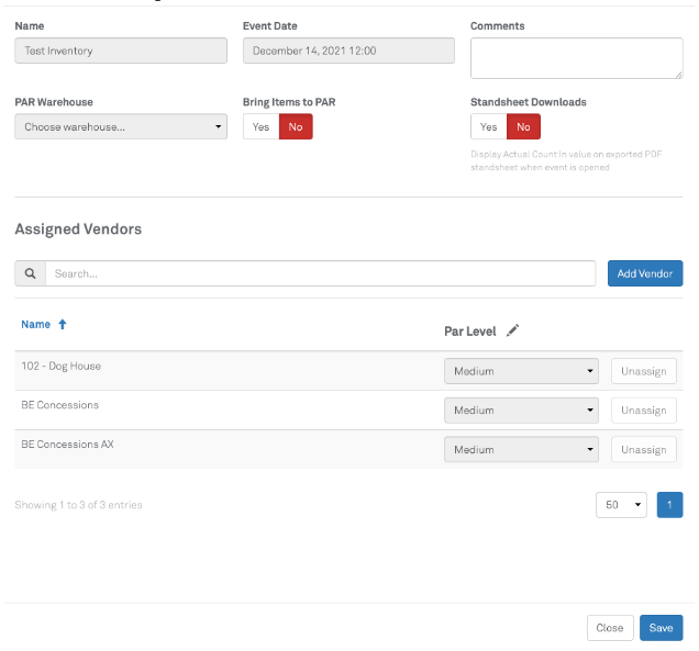 - Bring Items to Par - If Par Levels are configured, this setting will automatically create Pre-event transfers to stock items and bring them to Par.