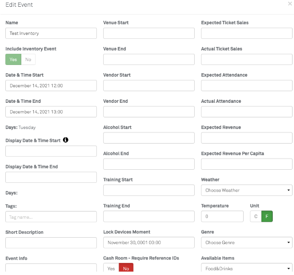 - Other optional settings include descriptions, alcohol start/end times, expected attendance, weather, genre, tour, etc.