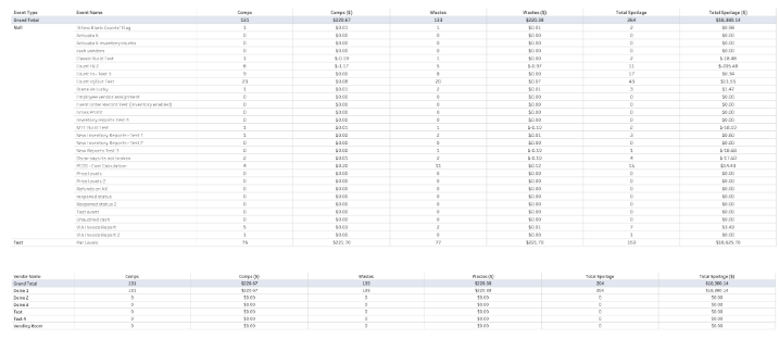 The Revenue Reconciliation report displays a summary of sales and revenue for each vendor and compares inventory sales against POS Sales and revenue grouped for a given event or period. This report is most often used to determine discrepancies between inventory and POS Sales, and revenue.