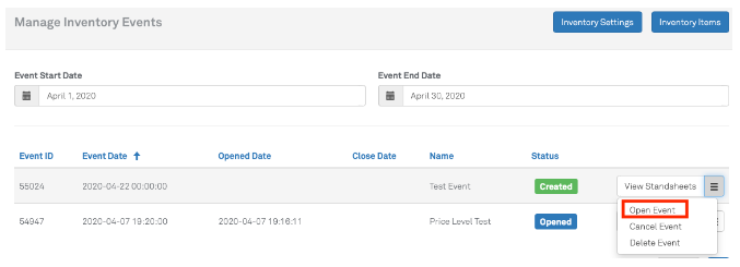 Once an Inventory Event has been created, select Events on the left side menu and select 'Manage Events' from the dropdown. A list of events will be displayed based on the date range selected.