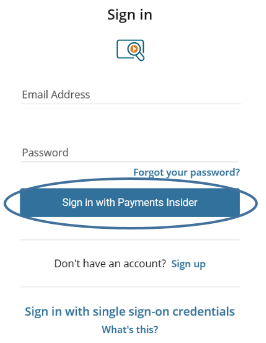 All new users get created with single sign-on credentials. If that applies to you, once you provide your login credentials and click Sign in with Payments Insider, a pop-up window will appear where you need to click the blue button Continue to single sign-on. This will redirect you to a new login page where you will need to enter your credentials again. If you have not created single sign-on credentials, provide your email address and password and click Sign in with Payments Insider only.
