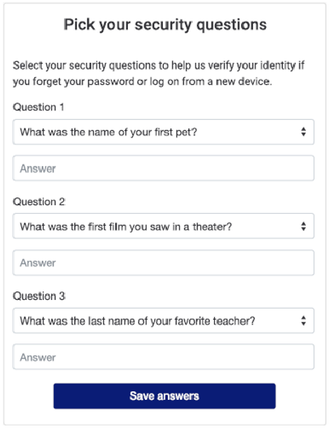 Once you click "Sign up," you will go to the next page, where you need to select your security questions and provide answers. You will have only one try to provide the correct answer for your security question if the system asks you to do so.