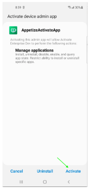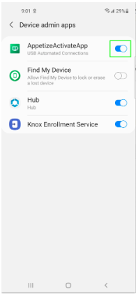 - Enable Device admin for AppetizeActivateApp by toggling the radio button to ON.